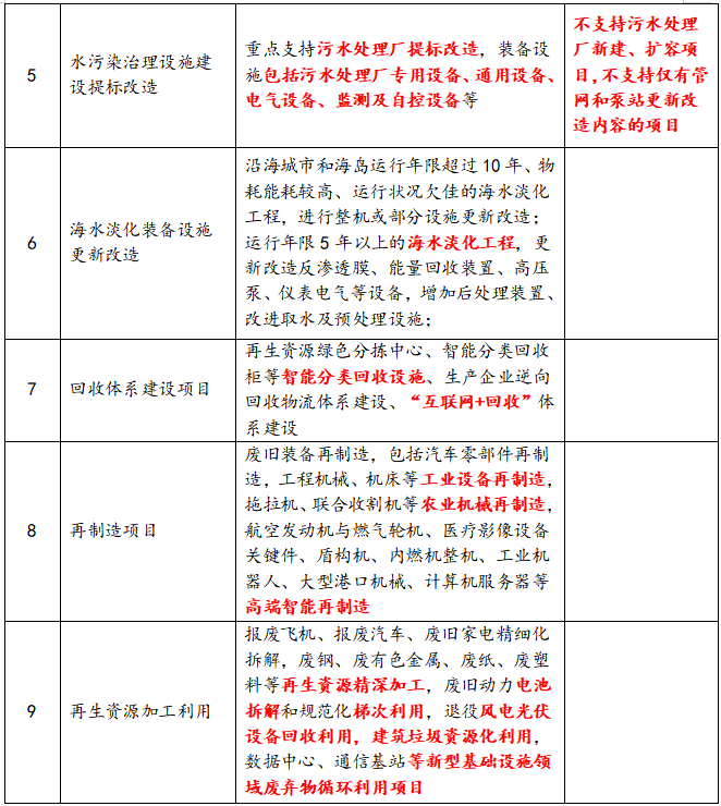 回收体系建设项目、汽车零部件,工程机械等废旧装备再制造项目;报废飞机、报废汽车、废钢、建筑垃圾、废旧电池等再生资源加工利用项目。