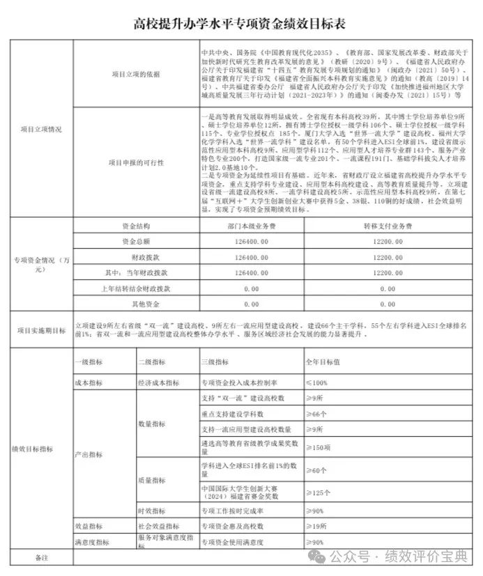 (1)预期产出。包括提供的公共产品和服务的数量目标、质量目标、时效目标、成本目标等。