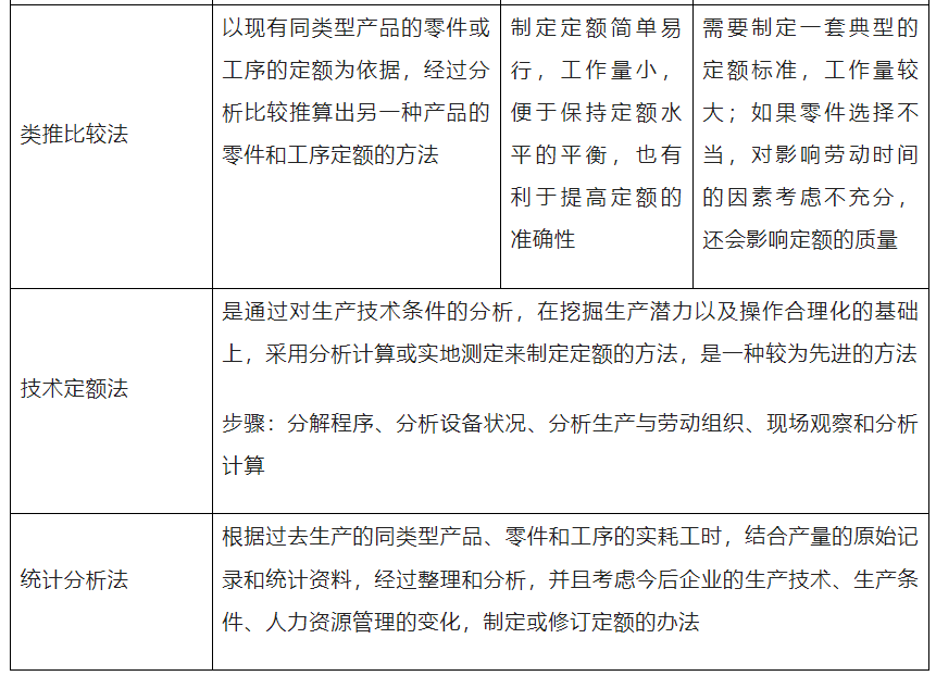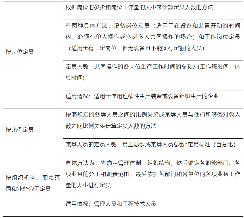 定编设计具有一定的时效性,并应严格遵循一定的原则。重点依据计划期内的企业目标和业务量以及各类人员的工作效率。①直接与非直接经营人员的比例关系;②内部各种岗位之间的比例关系;③管理人员与全体员工的比例关系。定编管理的方法主要有劳动效率定编法、业务数据分析法、本行业比例法、预算控制法、和业务流程法五种。定额管理(norm management)是指利用定额来合理安排和使用人力、物力、财力的一种管理方法。实行定额管理,对于节约使用原材料,合理组织劳动,调动劳动者的积极性,提高设备利用率和劳动生产率,降低成本和提高经济效益均有极其重要的作用。定额能充分反映新的生产水平(先进的生产技术、先进的生产组织条件、先进的操作方法和先进的工作经验等);结合企业现有的生产水平,使员工整体达到并突破现有的定额水平定额要迅速及时,方法简便易行,工作量小,及时满足生产和管理需要;准确反映生产技术水平;凡是需要和可能制订劳动定额的产品、车间、工种都要有定额。企业内部产品之间、车间之间、工种之间、工序之间完成定额的可能性大体一致。常用的企业定额方法有经验估工法、工作日写实法、类推比较法、技术定额法和统计分析法,具体如下表6-5所示。