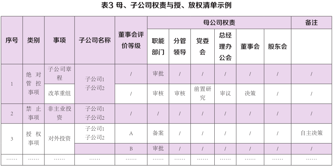 具体来讲,国有企业应坚持对各类授权事项“可授可收”,以“董事会评价+动态调整”为手段,建立健全对子公司董事会适度授权、分类管理、有效监督的动态授权管理机制,形成授权、监管、评价、调整的闭环管理体系。授权过程中,应制定母、子公司权责与授、放权清单,落实精细化管理。横向上,可根据权责进行划分,明确各类事项涉及公司总部的层级,以及最终决策主体。纵向上,可根据事项进行分类,例如绝对管控事项,包括子公司章程、主责主业、改革重组、年度经营计划等重大事项;禁止事项,禁止子公司从事的业务活动或者非主业投资等;授权事项,根据子公司董事会建设水平谨慎授权,考量决策复杂程度、风险可控程度,给予一定权限内的经营管理权、投资决策权、财务管理权和人事管理权等(见表3、图1)。