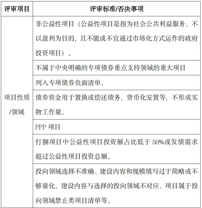 前置条件评审,主要对评价项目能不能达到专项债券发行基本条件,前置条件有一项不符合的,即评审不通过(实行一票否决权)。