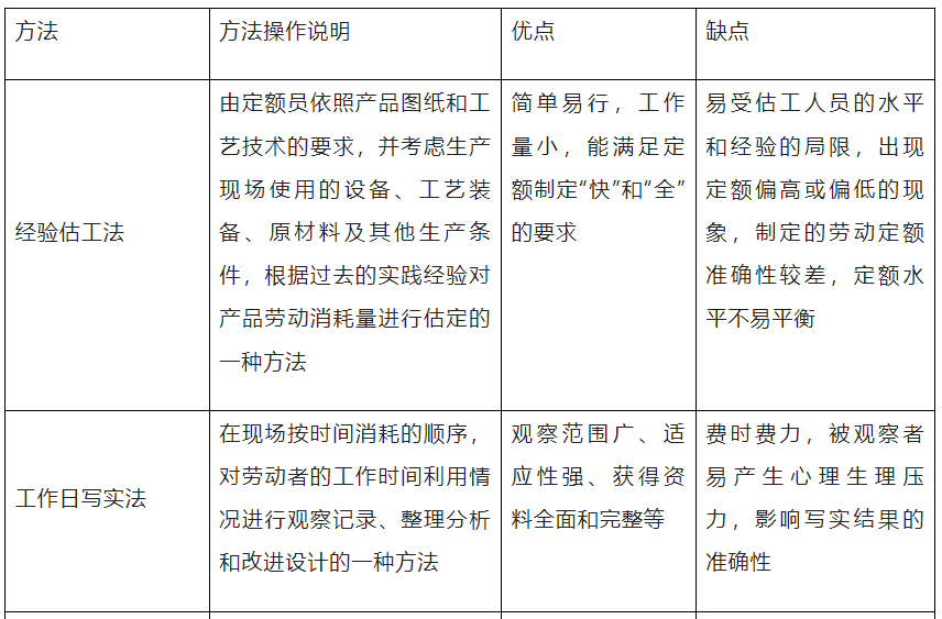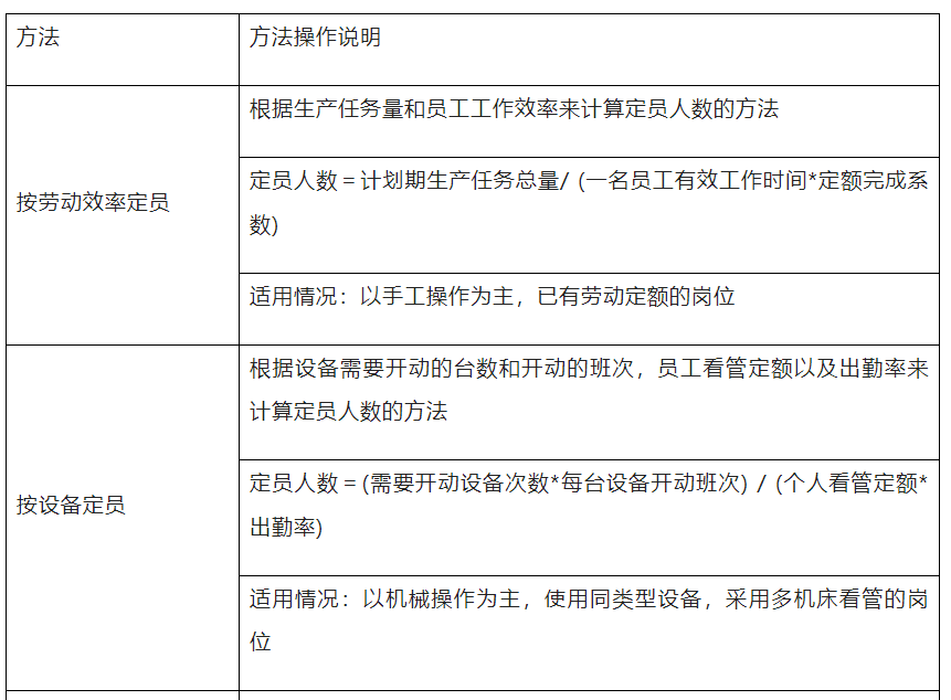 定编设计具有一定的时效性,并应严格遵循一定的原则。重点依据计划期内的企业目标和业务量以及各类人员的工作效率。①直接与非直接经营人员的比例关系;②内部各种岗位之间的比例关系;③管理人员与全体员工的比例关系。定编管理的方法主要有劳动效率定编法、业务数据分析法、本行业比例法、预算控制法、和业务流程法五种。定额管理(norm management)是指利用定额来合理安排和使用人力、物力、财力的一种管理方法。实行定额管理,对于节约使用原材料,合理组织劳动,调动劳动者的积极性,提高设备利用率和劳动生产率,降低成本和提高经济效益均有极其重要的作用。定额能充分反映新的生产水平(先进的生产技术、先进的生产组织条件、先进的操作方法和先进的工作经验等);结合企业现有的生产水平,使员工整体达到并突破现有的定额水平定额要迅速及时,方法简便易行,工作量小,及时满足生产和管理需要;准确反映生产技术水平;凡是需要和可能制订劳动定额的产品、车间、工种都要有定额。企业内部产品之间、车间之间、工种之间、工序之间完成定额的可能性大体一致。常用的企业定额方法有经验估工法、工作日写实法、类推比较法、技术定额法和统计分析法,具体如下表6-5所示。